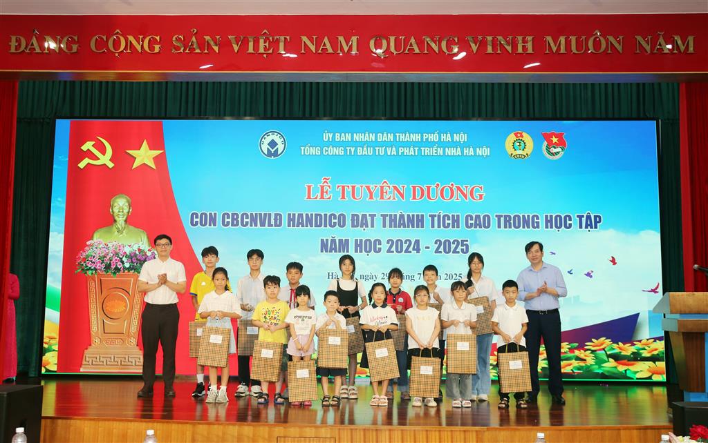 Đại diện Cơ quan Ủy ban mặt trận Tổ quốc Thành phố và lãnh đạo HANDICO trao tặng phần thưởng cho các cháu đạt thành tích cao trong học tập năm học 2024-2025