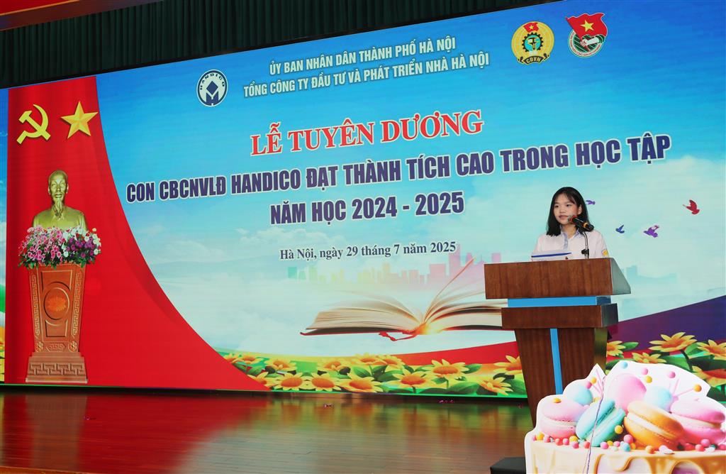 Cháu Vũ Trần Khánh Vân (con đồng chí Vũ Tiến Thành, công tác tại Công ty Đầu tư xây dựng số 2 Hà Nội – đơn vị thành viên thuộc HANDICO) đại diện cho toàn thể các con CBCNVLĐ trong Tổng công ty phát biểu tại Lễ Tuyên dương.