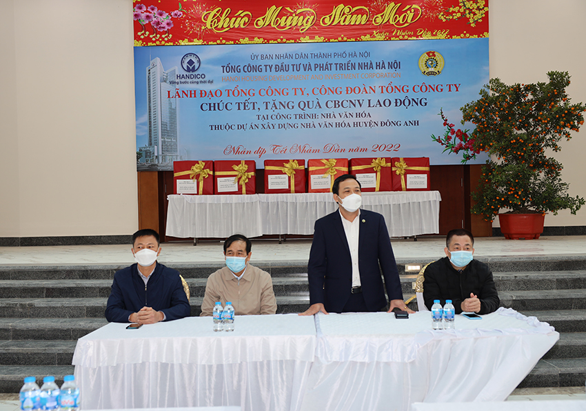 (HANDICO) - Nhân dịp Xuân mới Nhâm dần 2022, ngày 19/01/2022, Lãnh đạo Tổng công ty Đầu tư và Phát triển nhà Hà Nội và Công đoàn Tổng công ty đã đến tặng quà, chúc Tết cán bộ, công nhân viên, người lao động đang làm việc tại công trường thi công Nhà văn hóa huyện Đông Anh, Hà Nội.