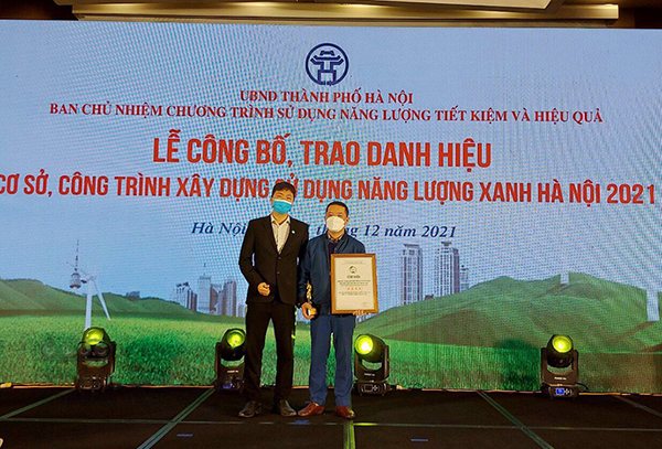 Anh Bùi Đăng Hải (bên phải) nhận danh hiệu “Năng lượng xanh 4 sao” Công trình xây dựng sử dụng năng lượng xanh Hà Nội 2021 cho Tòa nhà HANDICO TOWER