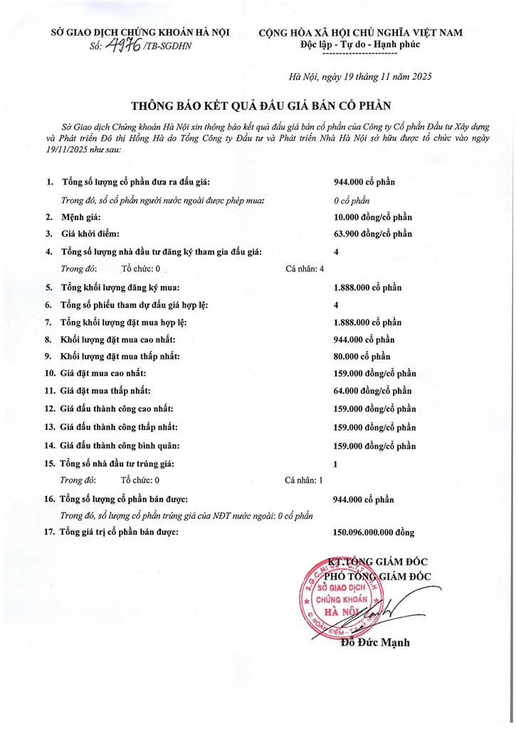 (HANDICO) – Tổng công ty Đầu tư và Phát triển nhà Hà Nội (HANDICO) công bố kết quả đấu giá bán cổ phần của Công ty Cổ phần Đầu tư Xây dựng và Phát triển Đô thị Hồng Hà (CT4) do Tổng công ty Đầu tư và Phát triển nhà Hà Nội sở hữu được tổ chức vào ngày 19/11/2025 tại Sở Giao dịch Chứng khoán Hà Nội. Thông tin chi được gửi kèm theo Thông báo số 4976/TB-SGDHN ngày 19/11/2025 của HNX.