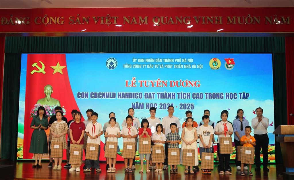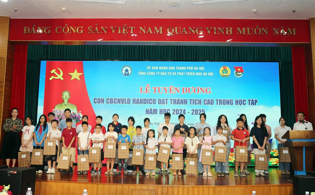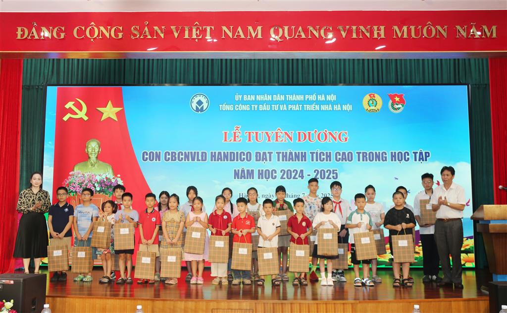 Đại diện Cơ quan Ủy ban mặt trận Tổ quốc Thành phố và lãnh đạo HANDICO trao tặng phần thưởng cho các cháu đạt thành tích cao trong học tập năm học 2024-2025